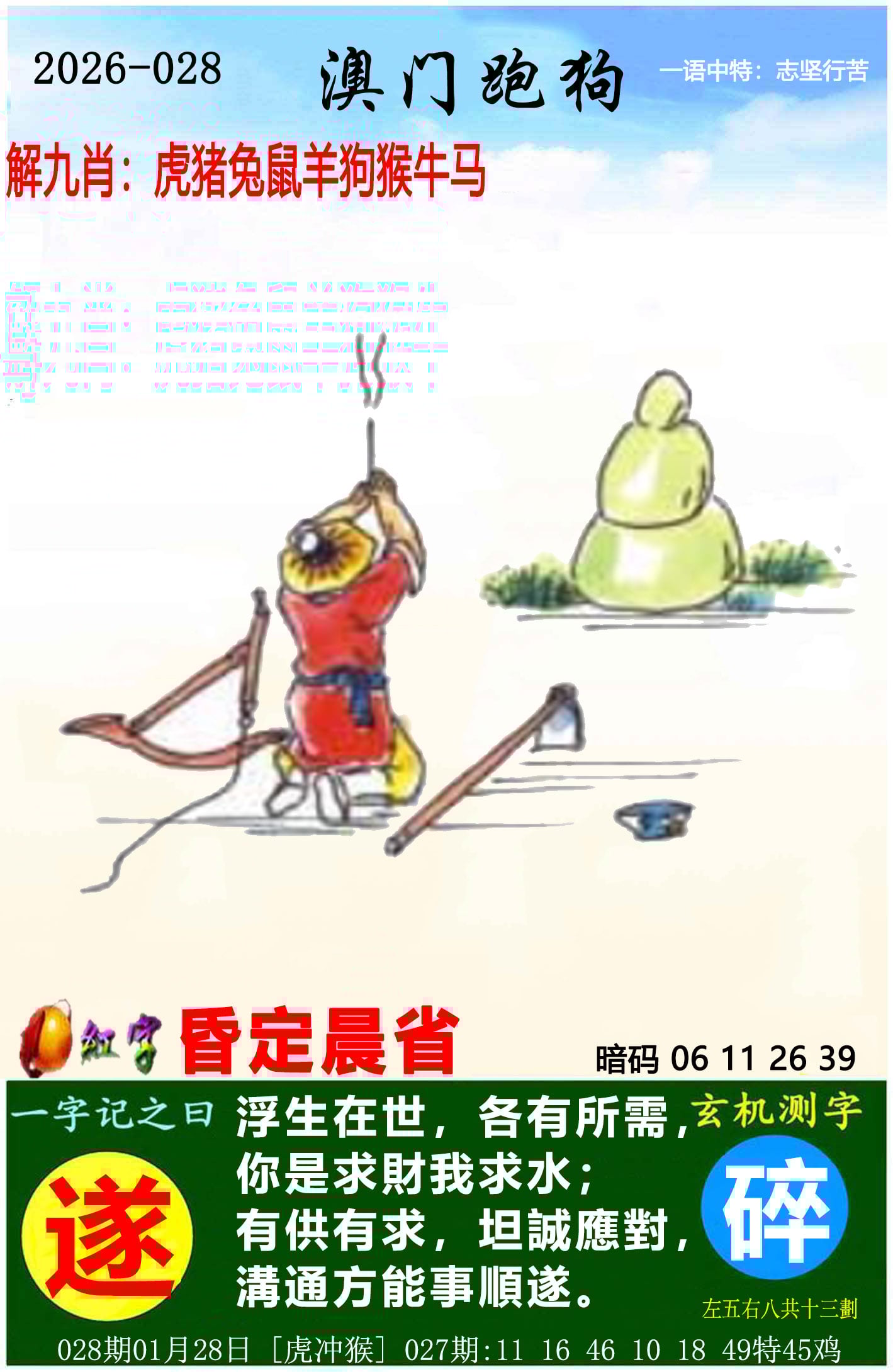 028期开奖时间2026年01月28 星期三)晚9:30开(农历十二月初十 虎冲猴)028期【欲钱买龙色飞舞的生肖】